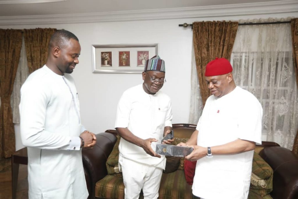 The Executive Governor of Benue State, Samuel Ortom paid a courtesy visit to the Chief Whip of the Senate and former Governor of Abia state, Senator Orji Uzor Kalu in his Aso villa residence, Abuja.Â