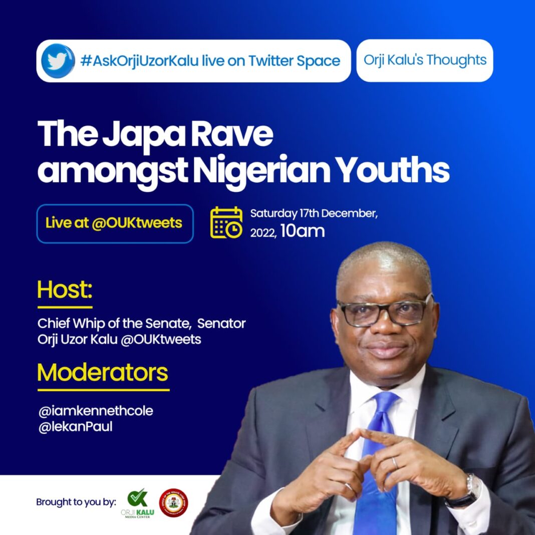 The session tagged ; “The Japa Rave amongst Nigerian Youths: Orji Kalu’s Thoughts” will be hosted on the Chief Whip’s official Twitter Handle @OUKtweets and to be moderated by @iamkennethcole and @lekanPaul.
